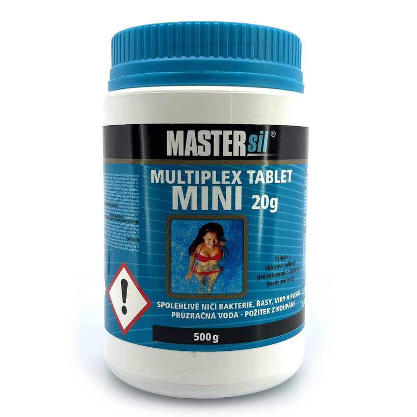 Prípravok MASTERsil Multiplex tablet mini sú 20g pomaly rozpustné tablety určené k všestrannej starostlivosti o vodu v bazéne po celú sezónu. V každej tablete je vedľa vysoko účinného chloračného prostriedku obsiahntý tiež algicid, vločkovač a stabilizátor chlóru čo dodáva tomuto výrobku mnohostranné účinky. Tablety majú baktericídne, fungicídne, vírucídne a algicídne účinky. Likvidujú baktérie, kvasinky, plesne, vírusy a riasy. Obsiahnutý vločkovač napomáha filtrovať aj veľmi jemne roztýlené nečistoty a stabilizátor chlóru napomáha zníženiu chlórového zápachu nad hladinou.
