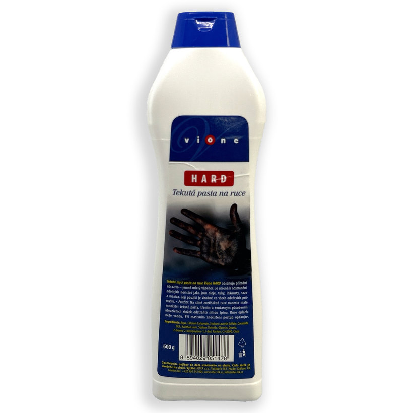 Tekutá umývacia pasta na ruky VIONE HARD obsahuje prírodné abrazivo - jemne mletý vápenec. Pasta je určená na odstránenie odolných nečistôt ako sú: oleje, tuky, atramenty, sadze a mazivá. Jej použitie je vhodné vo všetkých odvetviach priemyslu.