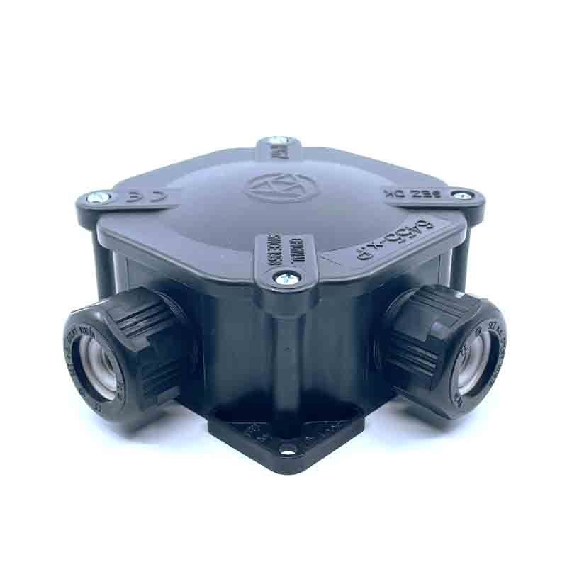 Čierna rozvodná krabica ACEDUR 6455-11P/5 s mostíkmi.
