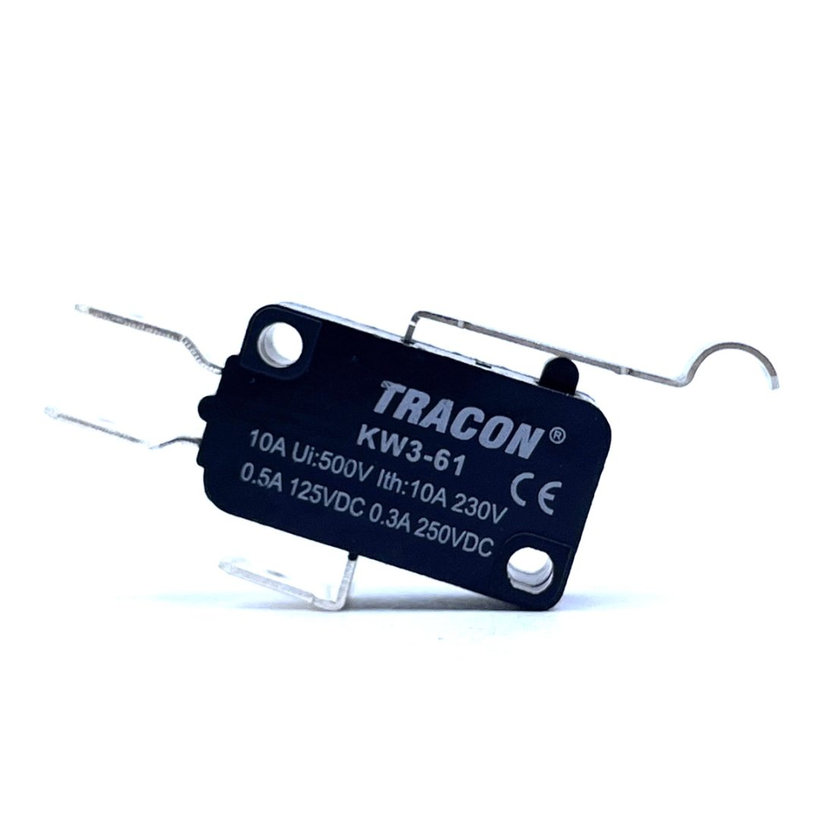 Mikrospínač s tvarovou pákou značky Tracon Electric s kontakty 1×CO, menovitým tepelným prúdom 10A a menovitým napätím 230V.