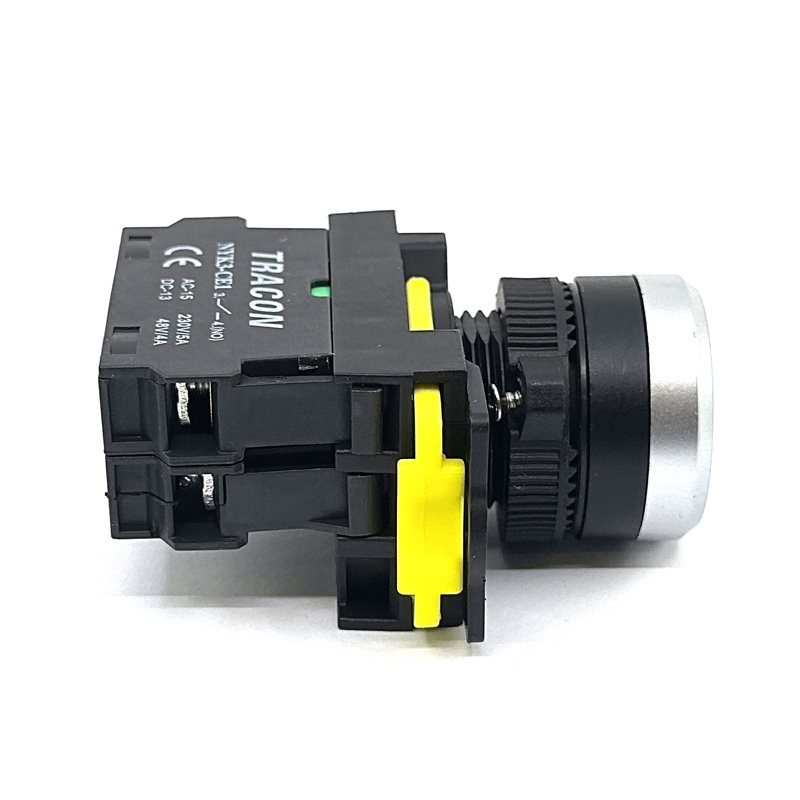 Podsvietený tlačidlový spínač odolný proti vibráciám s kontakty 1xNO (spínací), menovitým napätím 230V a menovitým prúdom 5A.