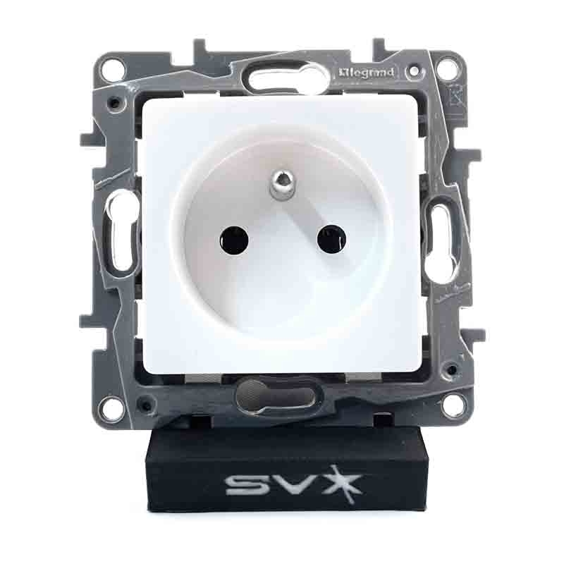 Rozšírte svoju inštaláciu domových prístrojov Legrand Niloé o jednoduchú bielu zásuvku. K zásuvke je treba dokúpiť vhodný rámček a elektroinštalačnú krabicu. Biela zásuvka Legrand Niloé 2P + T s ochranným kolíkom bez cloniek má menovitý prúd 16 A a napätie 250 V.