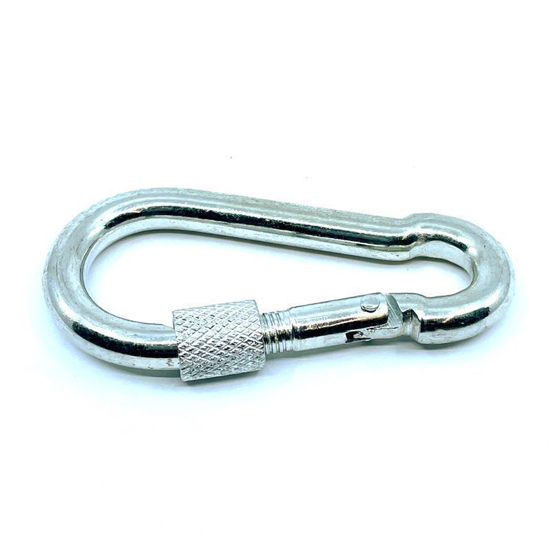 Karabína s poistkou DIN 5299D pozinkovaná je oceľová karabína s povrchovou úpravou v bielom galvanickom zinku pre lepšiu odolnosť proti abrázii a mechanickému poškodeniu. Vďaka tomu je karabína použiteľná aj v náročných podmienkach.