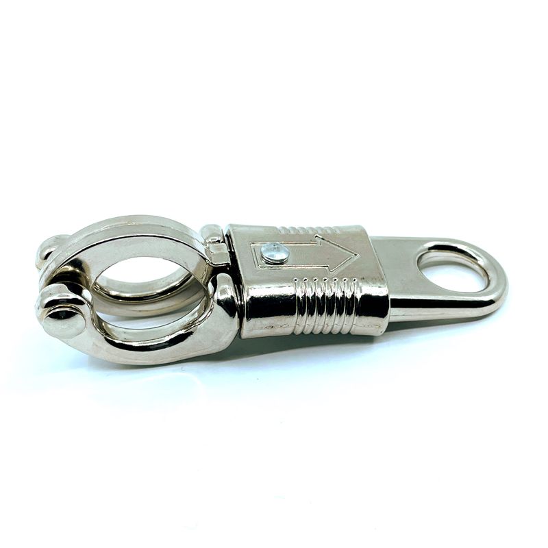 Bezpečnostná karabína PANIK s pevným krúžkom a okom pre viazacie laná. Vhodná pre kone, dobytok, psov. Pri vedení psa, ktorý sa náhle splaší, sa karabína otvorí a zabráni tak poraneniu vašej ruky.