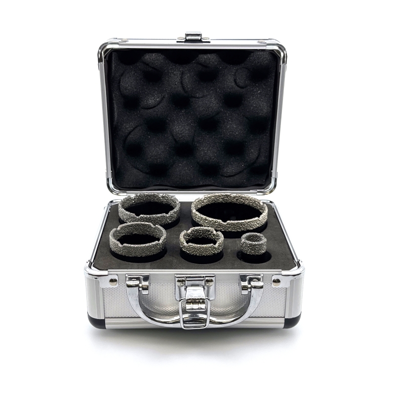 Vyrezávacia sada diamantových vrtákov v praktickom kufríku. Tieto vrtáky zaručujú rýchlosť vŕtania do najtvrdších materiálov.