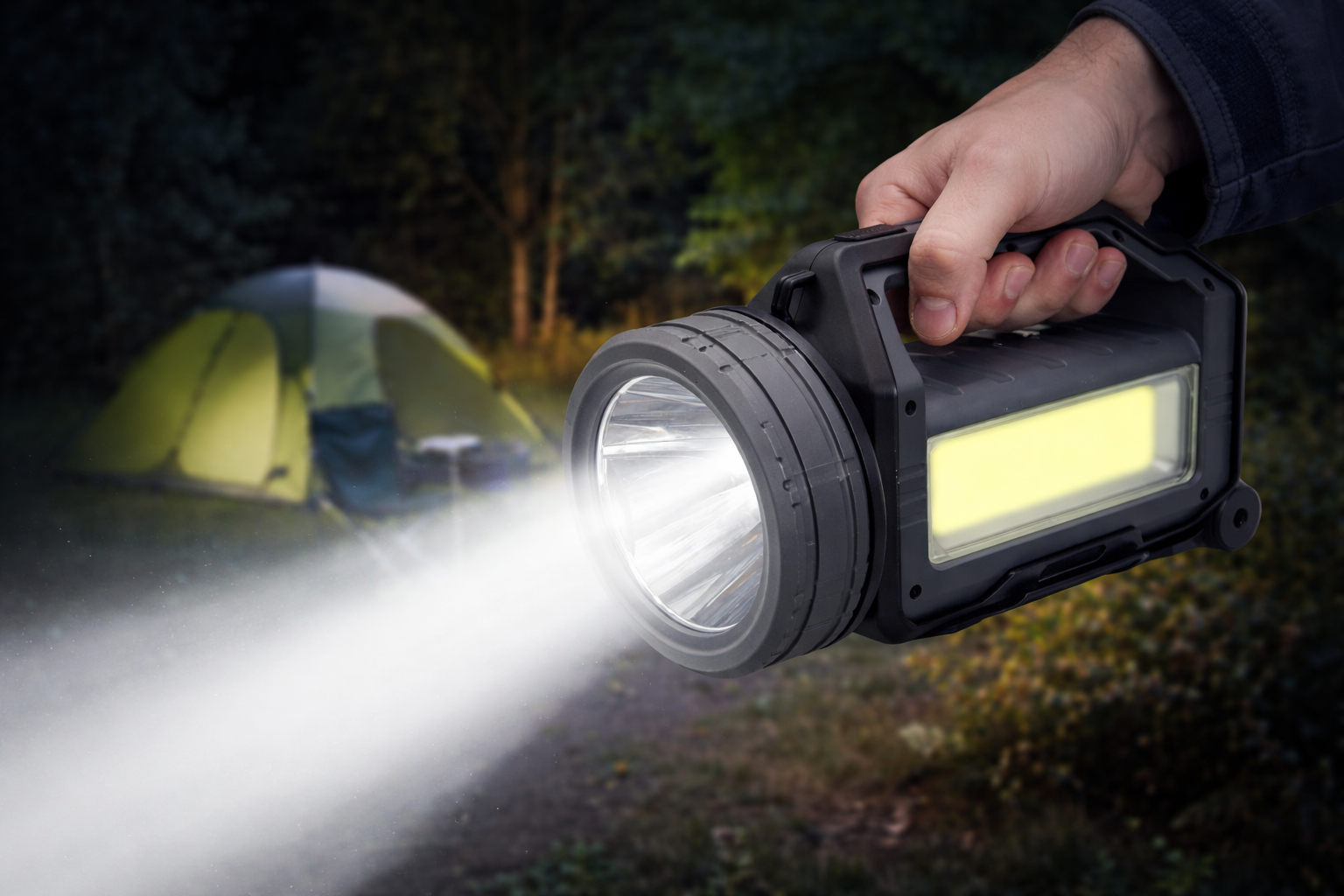 Výkonné dobíjacie ručné svietidlo s hlavným bodovým svetlom až 2400 lm a dvoma bočnými COB svetlami (360 lm) je ideálne na prácu v dielni, na stavbe, do garáže aj na outdoor. Vďaka 4 samostatne zapínateľným svetelným zdrojom si osvetlenie prispôsobíte presne podľa situácie. Nechýba ani zadné červené svetlo s blikaním pre lepšiu viditeľnosť a bezpečnosť. Svietidlo má nastaviteľný držiak a 8 mm pripojenie na statív pre flexibilnú montáž. Integrovaná Li-Ion batéria 3,7 V / 4,0 Ah sa nabíja cez USB-C a môžete ju využiť aj ako powerbanku na nabíjanie telefónu.