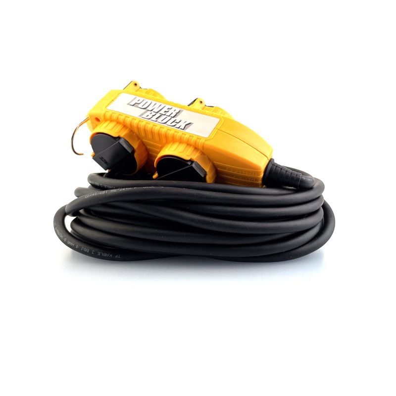 Ideálne pre tvrdé nasadenie na staveniskách, v dielňach a v oblasti priemyslu. Kvalitný zásuvkový blok odolný proti nárazu a rozbitiu má 4 zásuvky pootočené o 45 °.Chránený proti striekajúcej vode je so samozatváracími ochrannými viečkami. So sklopným kovovým hákom.