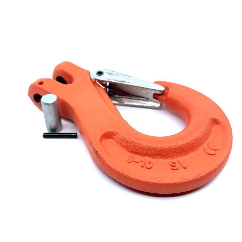Vidlicový hák pevnostnej triedy 100 je vyrobený z vysoko kvalitnej ocele a jeho povrchovou úpravou je komaxit v oranžovej farbe. Používa sa na výrobu reťazových závesov a zdvíhacích zariadení pomocou reťazí. Na pripevnenie na reťaz sa používa zaisťovací čap, ktorý je upevnený závlačkou, čo umožňuje rýchlu inštaláciu háku bez použitia spojovacieho článku. Preto, aby sa zabránilo náhodnému odopnutiu bremena, je súčasťou háku kovaná západka. Správny dizajn, starostlivé kovanie, precízne kontrolované kalenie a temperovanie poskytujú maximálnu pevnosť bez nadmernej hmotnosti a objemu.