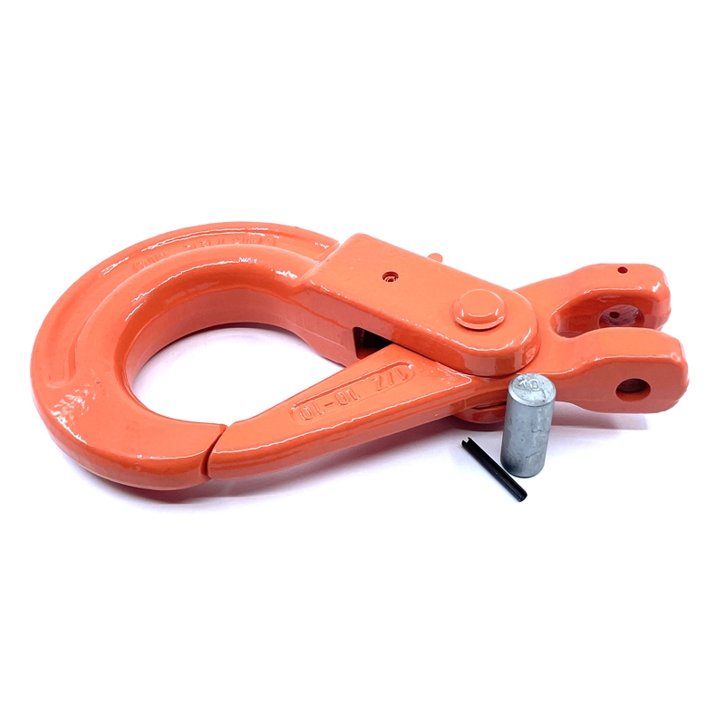 Samozaisťovací hák s vidlicou pevnostnej triedy 100 je vyrobený z vysoko kvalitnej ocele a jeho povrchovou úpravou je komaxit v oranžovej farbe. Tento hák slúži ako spojovací komponent pre stavebný a lesnícky priemysel. Používa sa predovšetkým v spojení s lanom alebo reťazou na zdvíhanie či spúšťanie bremien. Na pripevnenie na reťaz sa používa zaisťovací čap, ktorý je upevnený závlačkou, čo umožňuje rýchlu inštaláciu háku bez použitia spojovacieho článku. Správny dizajn, starostlivé kovanie, precízne kontrolované kalenie a temperovanie poskytujú maximálnu pevnosť bez nadmernej hmotnosti a objemu.