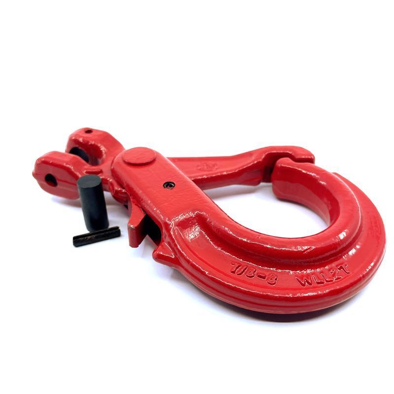 Samozaisťovací hák s vidlicou pevnostnej triedy 80 je vyrobený z vysoko kvalitnej ocele a slúži ako spojovací komponent pre stavebný a lesnícky priemysel. Jeho povrchovou úpravou je KOMAXIT v červenej farbe. Používa sa predovšetkým v spojení s lanom alebo reťazou na zdvíhanie či spúšťanie bremien. Správny dizajn, starostlivé kovanie, precízne kontrolované kalenie a temperovanie poskytujú maximálnu pevnosť bez nadmernej hmotnosti a objemu. Na pripevnenie na reťaz sa používa zaisťovací čap, ktorý je upevnený závlačkou, čo umožňuje rýchlu inštaláciu háku bez použitia spojovacieho článku.